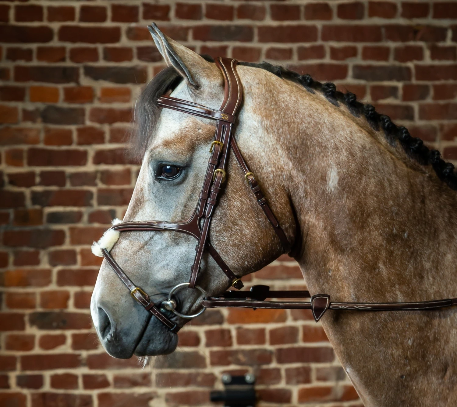 Dy’on collectie hoofdstel met mexicaanse neusriem is gemaakt van Engels leer en heeft een anatomisch S-vormig kopstuk. Voorzien van crèmekleurige sierstiksels op de front- en neusriem en koperkleurige gespen.