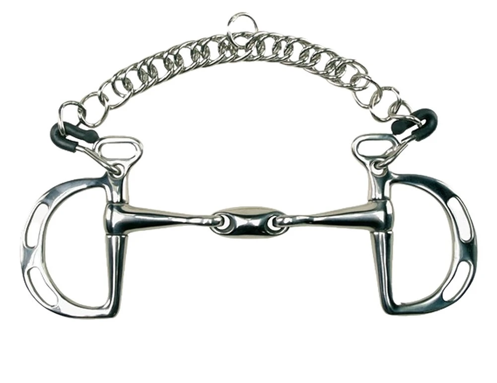- Dit zijstuk heeft 2 sleuven voor het bevestigen van één teugel. Hoe lager men de teugel plaatst, hoe groter de hefboomwerking wordt en het bit scherper wordt.
